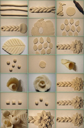 Dôkladne vymiesené cesto si rozdelíme na dve časti tak, aby jedna bola o čosi väčšia. Túto rozdelíme na tri časti a rukou vyvaľkáme tri šúľky. Z nich spletieme vrkoč tak, ako vidíme na obrázku. Menší kus cesta vyvaľkáme a pohárikom z neho vykrojíme kruh. Pritisneme ho ku koncom vrkoča tak, aby na ňom držal. Ostatné zvyšky cesta využijeme k dekoráciám. Opäť ho vyvaľkáme a pomocou šablóny z papiera vykrojíme z neho nožom listy. Ideálne je, ak máme formičku na vykrajovanie takéhoto tvaru. Na listy urobíme „žilky“ buď nožom, alebo tak, že ozajstný list priložíme rubom na cesto a prejdeme valčekom . Listy umiestnime na kruh z cesta a jemne pritlačíme. No a potom vyrobíme ružičku tak, ako vidíme na obrázku a z ostatných zvyškov cesta tvoríme malé jabĺčka, hrozno, kvietky – jednoducho to, čo nás napadne. Tu je obrázkový postup: