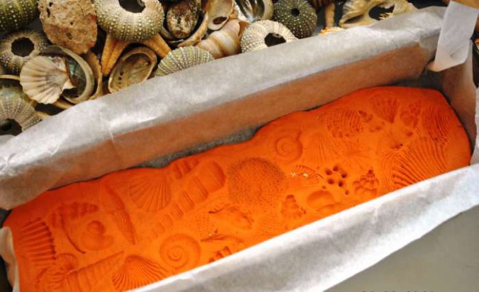 Keď je plastelína na dne zapekacej misy rovnomerne roztlačená, vyberieme ju (zručnejší nemusia) a otlačíme do nej rôzne morské lastúry, ulity, mušle a podobne. Potom ju vložíme späť do formy.